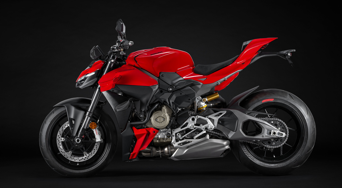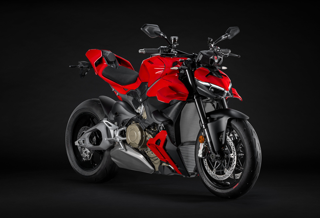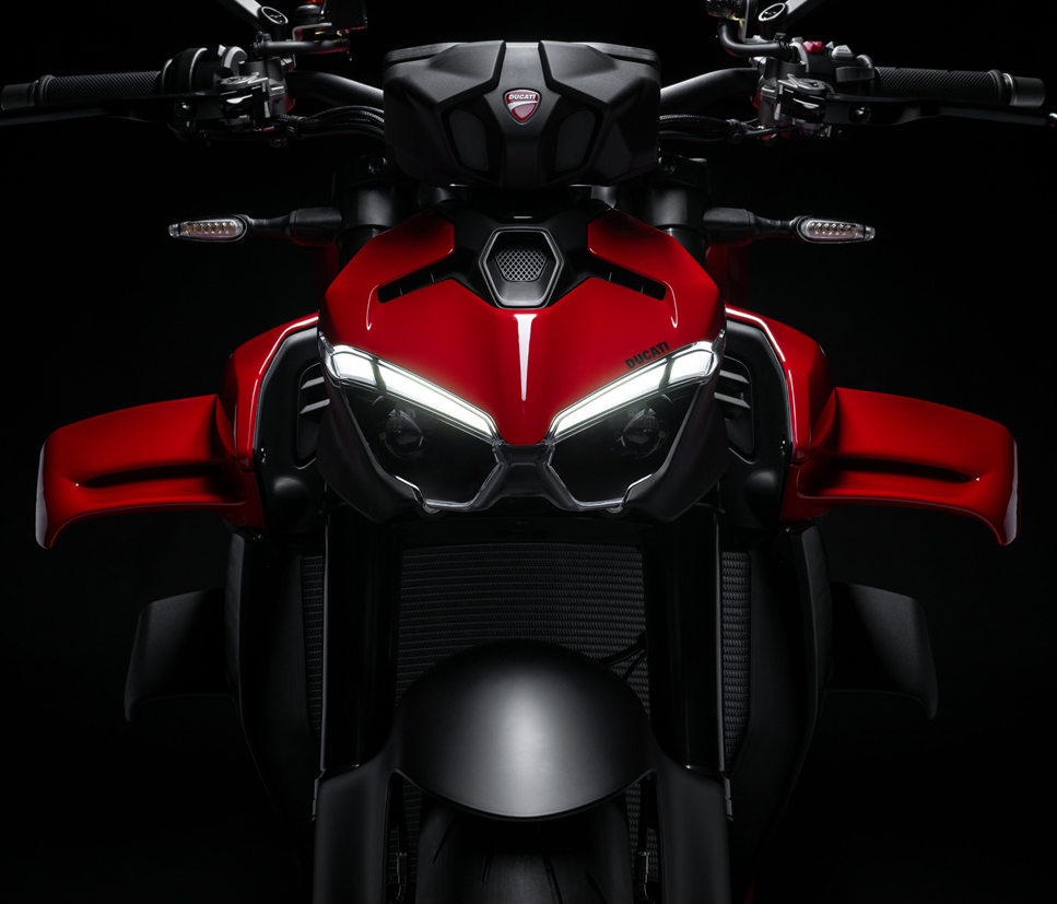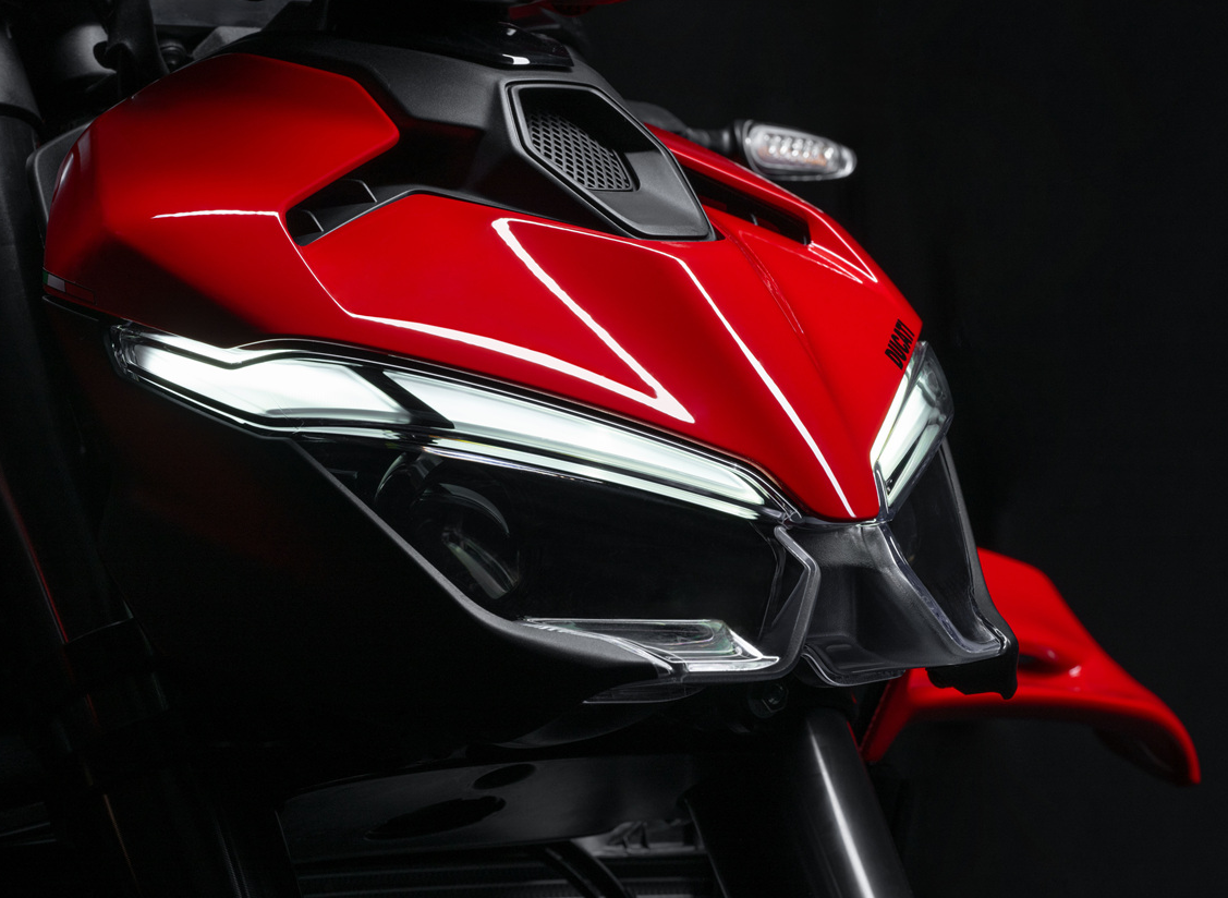 - 스트리트파이터 V4는 아름답고 날카로운 외형이 특징입니다. 특히 전면에는 새롭게 설계된 **바이플레인 윙(쌍익)**이 탑재되어 고속에서 다운포스를 증가시키는 동시에 시각적 임팩트를 줍니다.